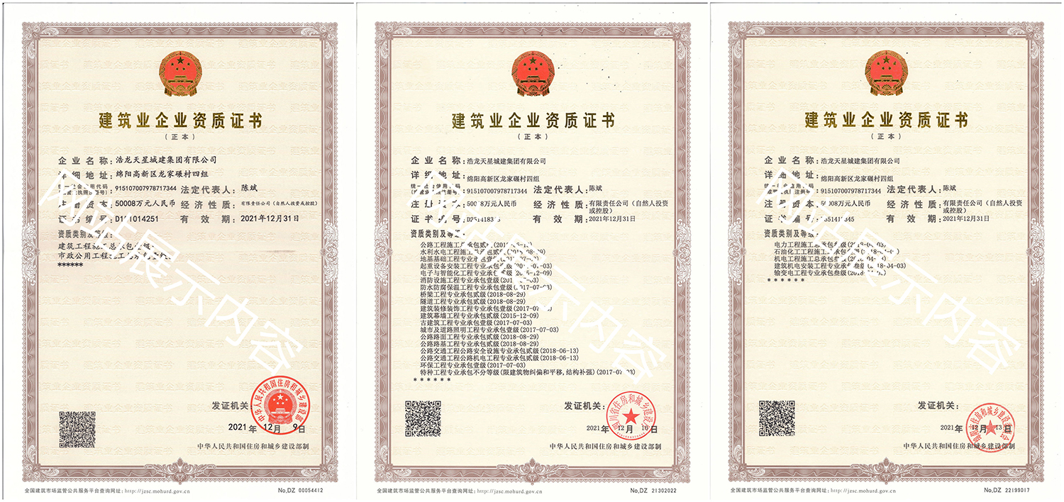 浩龍?zhí)煨浅墙瘓F有限公司,2007年成立于“李白故鄉(xiāng)、中國科技城”—四川省綿陽市,企業(yè)注冊資本金5.0008億元。公司共有27項建筑業(yè)企業(yè)資質,其中國家一級資質11項,二級資質10項,三級資質5項,特種資質不分等級1項,類別涵蓋建筑、市政、水利、機電、隧道、起重設備安裝等基礎及未來發(fā)展重點專業(yè)。公司下設三個辦事處,業(yè)務范圍輻射全國,在建項目三十余個,累計完成產值超11億元。公司是綿陽市建筑施工企業(yè)協(xié)會副會長單位、綿陽遂寧商會會長級單位、綿陽首批建筑業(yè)綠卡企業(yè),在綿陽本地企業(yè)中綜合實力名列前茅。
